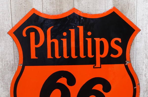 30"x29", good color and gloss on both sides, some edge chips and one mounting hole is damaged, still an 8.5 condition sign