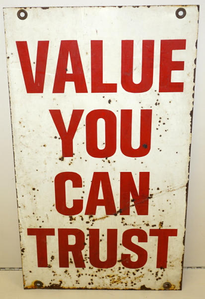 28"x16", good color, heavy edge wear and some paint loss, "Value…" Side has speckled rust spots and more wear, rates 8 condition overall