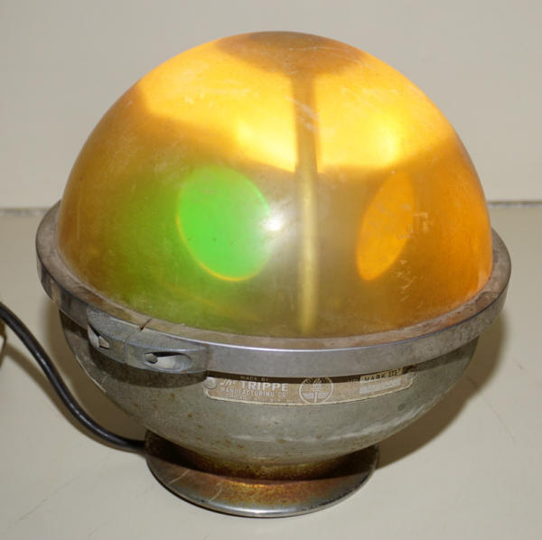 about 9" tall, 8" across, metal base with a plastic dome, has a rotating light inside, made in Chicago, IL; This was sent to us from a customer who's dad had this on a gas pump at his station in the 1950's; if the light was on and rotating, you got 2c off a gallon! Has some discoloration and wear, but does work, really unique piece for the gas pump collection!