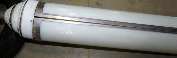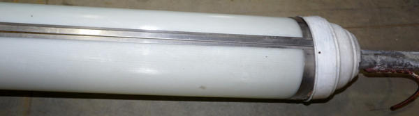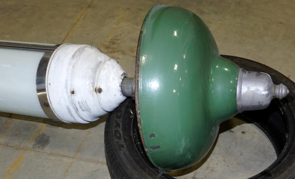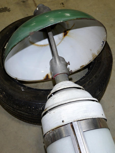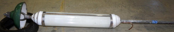 with the pole and everything, it's about 12' tall, the light itself is about 5' tall, both plastic lenses look good, looks to be pretty complete with the green porcelain shade on the top too, needs to be restored, but would be a great display piece in a restored gas station