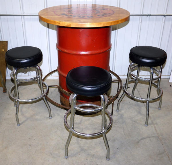this came out of Borrowed Buck's in Sioux Falls when we sold them out several years ago, nice clean stools, table has a used look to it, but unique, sells as a set; pickup only; 43" tall, 36" diam wood top