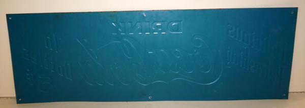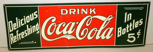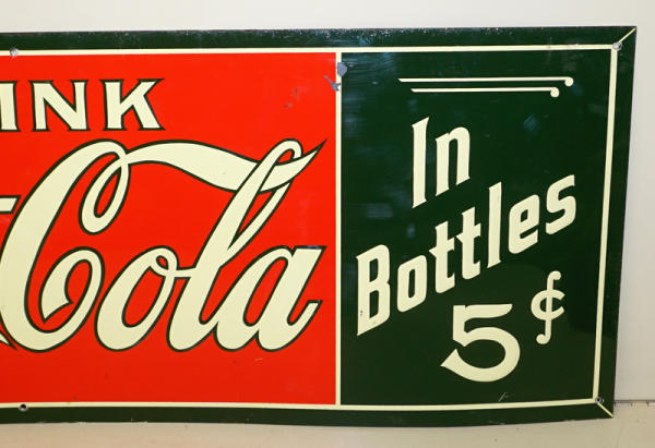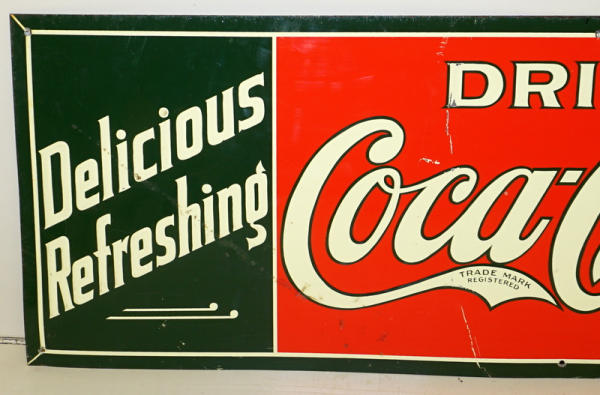 12"x35", great color, has a few larger scuffs in the face; no makers mark, some aging on the edges; I think this is an old original sign, but I will not guarantee