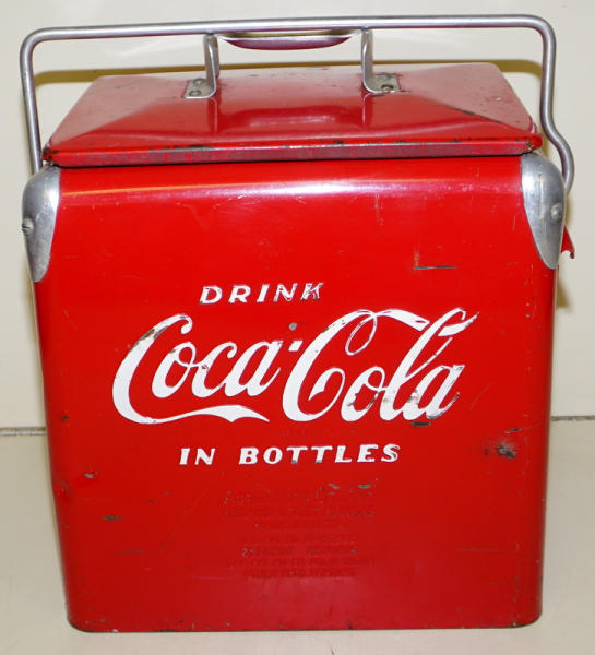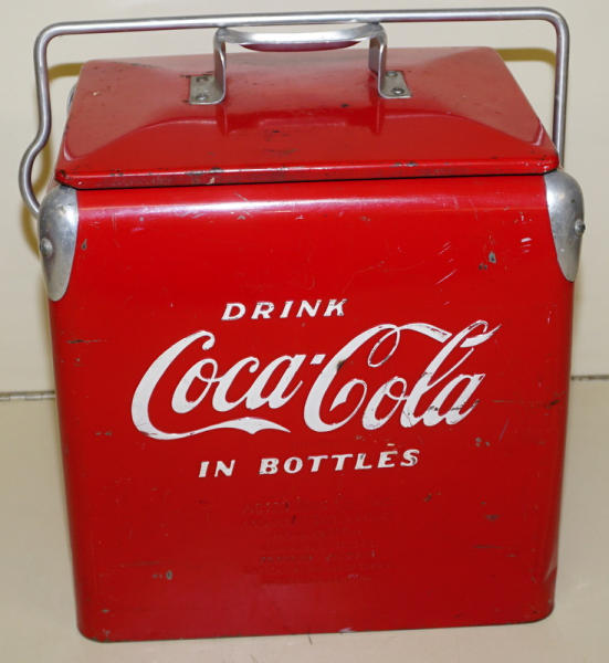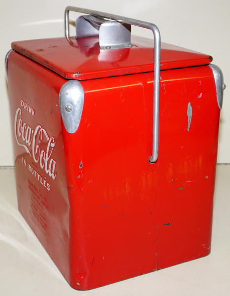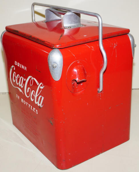 12-pack of bottles size, 14" tall, 9"x12" base, some scuffs and wear, but overall a nice original