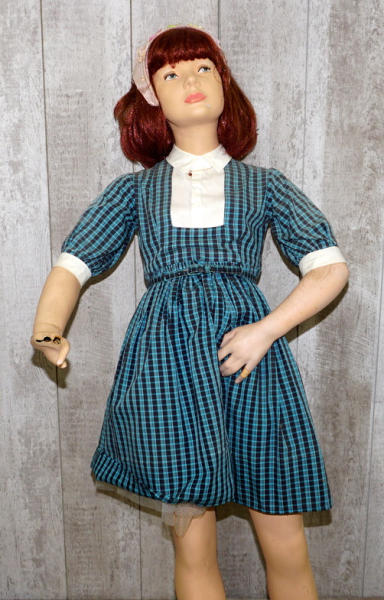 about 4' tall, 3 finger tips are broken off, but included, used, dress is faded, no shipping