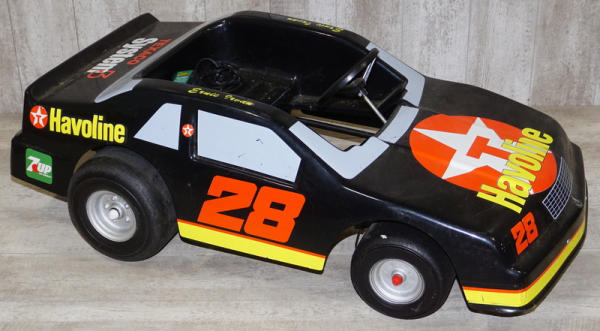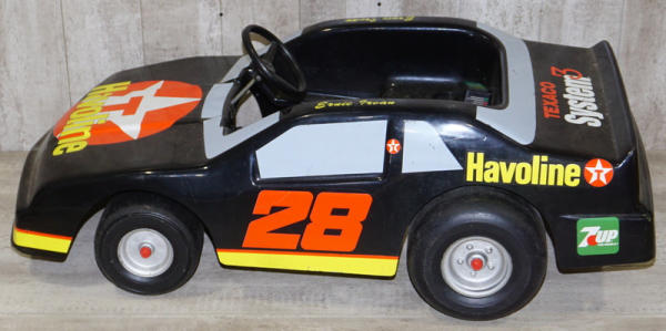 plastic, used, has the charger, I'm guessing it will need new batteries, has scuffs, scratches and some wear from driving, no shipping, pickup in Wakonda only