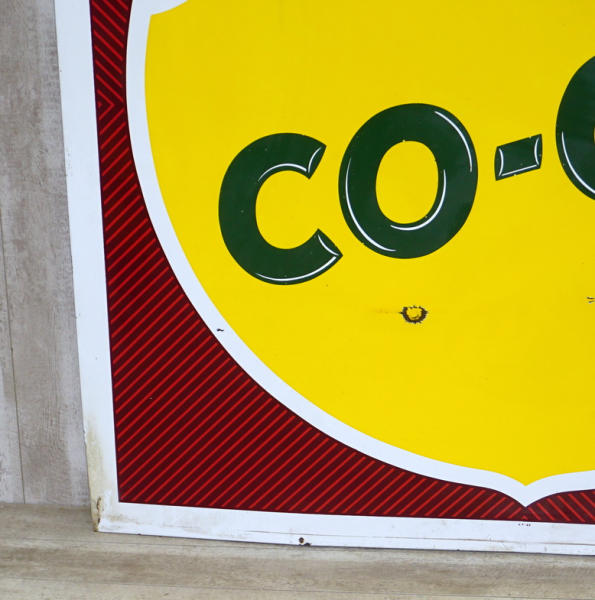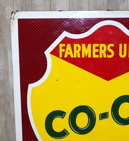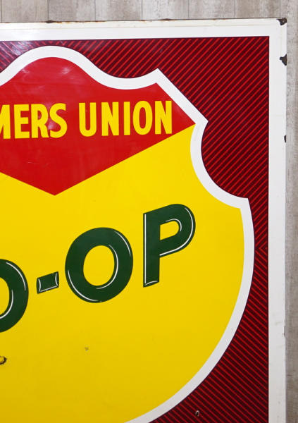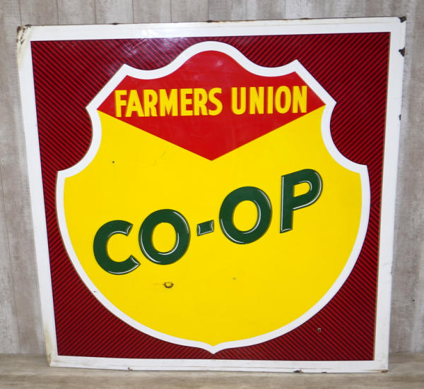 70"x70", super color, very nice condition, top left corner is dinged, has a 1.5" chip below "Co-", and a few edge chips, but overall for the size, its very nice, dated 1963; this is fresh out of a North Dakota barn! No shipping, pickup in Wakonda only