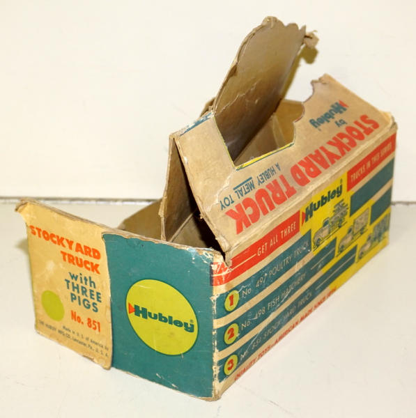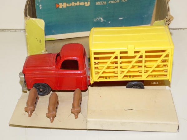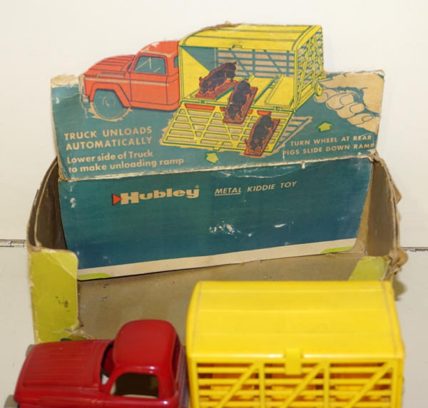 Truck is diecast cab w/ plastic box, toys are mint, box has the liner and complete, but pretty rough with quite a bit of wear, still a unique toy