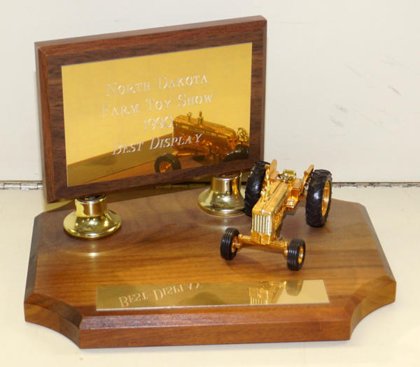 9" wide plaque, near mint condition, finish on the tractor has aged some, but still nice, very hard to find Toy Farmer Gold tractor!