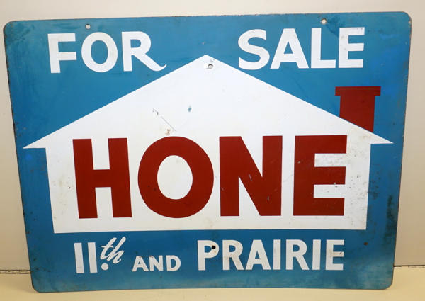 18"x24", neat graphics with a mid 1960's Chevy style truck, reverse side is a Home for Sale painted sign, has scuffs and wear