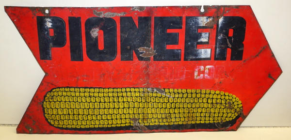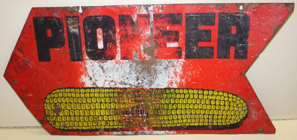 16.5"x34", poor condition, heavy fading and bent, very hard Pioneer sign to find, but condition is rough