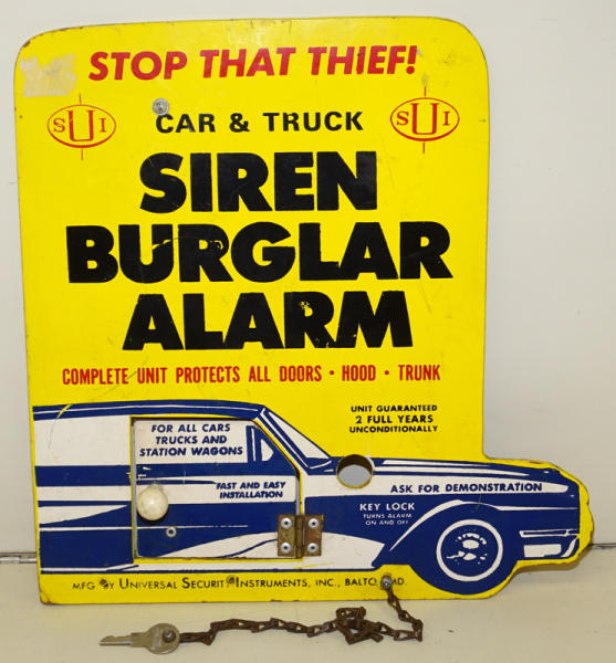 13.5"x13", I'd guess 1960's by the car graphics, painted masonite wood, has the key attached, but no mechanism when you open the door, some general wear