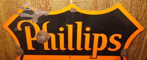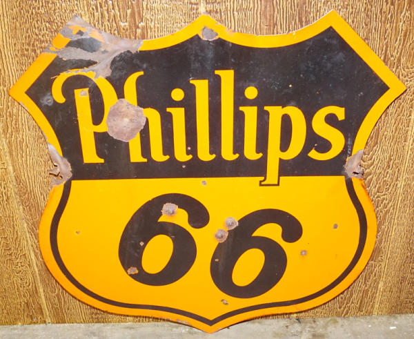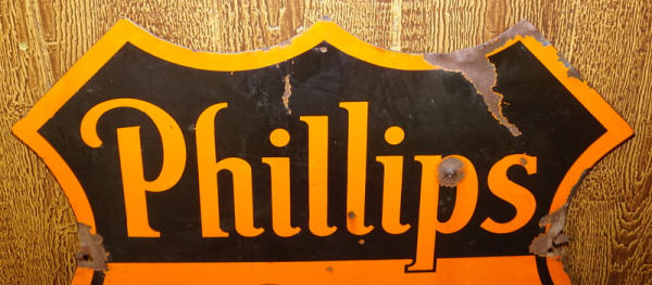 30"x30", has some bullet dents and chips, I'd say both sides are 6.5 to 7 condition, decent color, marked "Veribrite", good patina sign