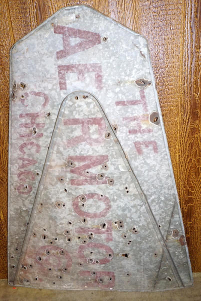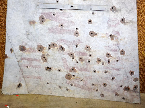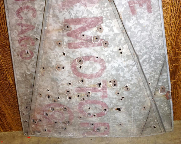 36"x48", many bullet holes, stenciling is faint, barn hanger