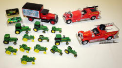 #302 - Box Lot of Misc JD Toys, Fire Trucks & CaseIH Truck