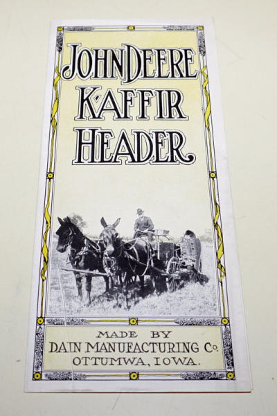 4-pages, a really unusual piece of equipment that attached to the side of a wagon like a 1-row picker, has a printing flaw on the cover, otherwise nice