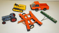 #517 - Box Lot of Vintage Farm Toys--CAT D6, AC Hurricane Pickup, Cast Iron Fordson & some implements