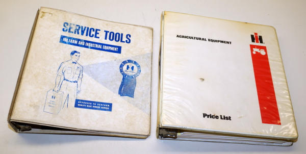 Price list binder is decent and full of dealer service bulletins, Service Tools binder is split on the side and has heavy wear, both to go