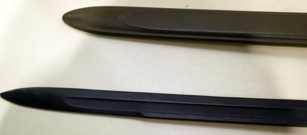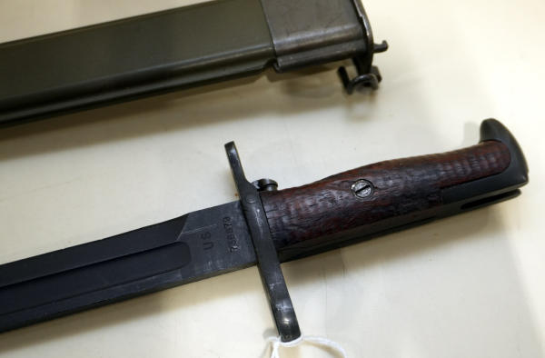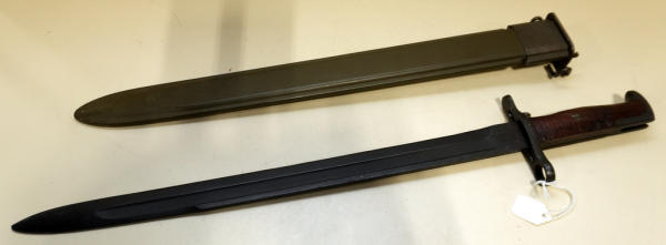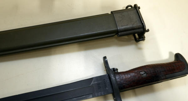 extremely nice condition; long blade 16"; sheath is marked USN MK. 1; has a K carved into the wooden handle; great bayonet