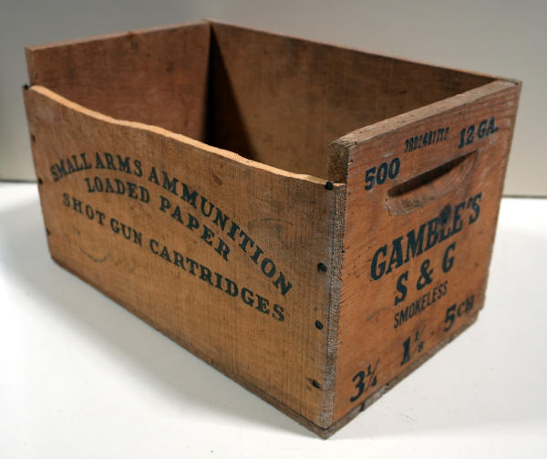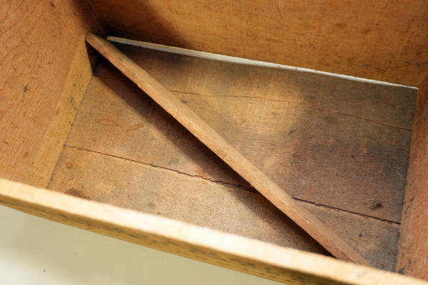 15"x9"x9"; one side has damage but piece is included; solid bottom with one slat cracked; really nice dark stenciling on all sides