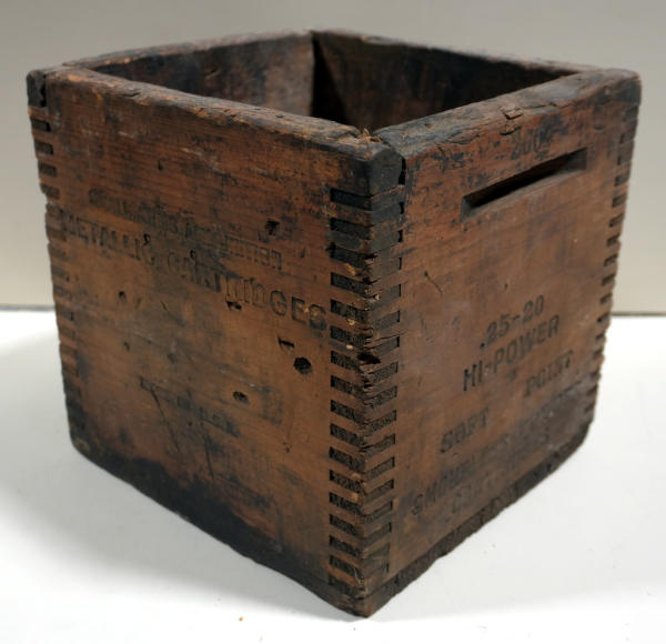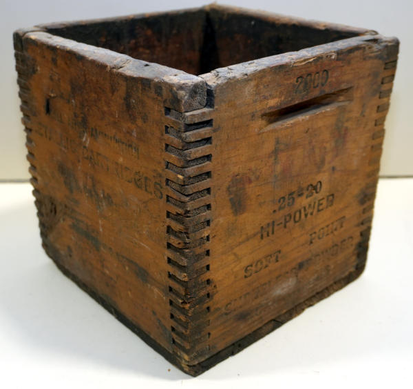 dovetail corners; stenciling is weak; wood has dark patina; solid bottom; 10"x9"x9"