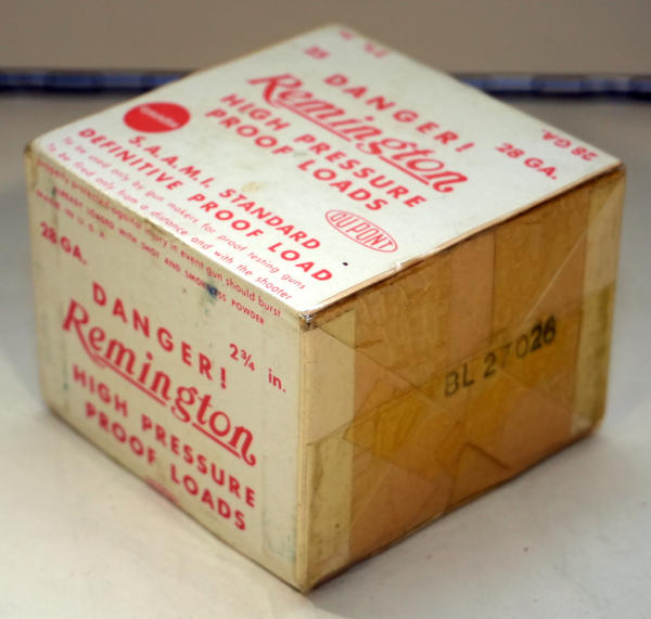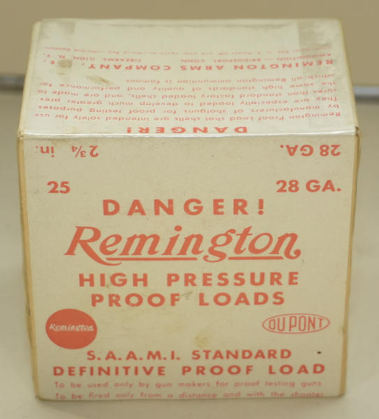 Factory sealed 2pc. Box; 2.75"; used at the Remington factory to proof 28ga. Shotguns, not an easy box to find especially in MINT condition; wrapped in plastic; 25 rounds