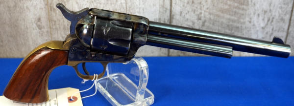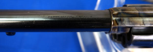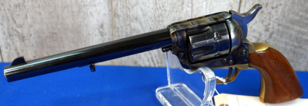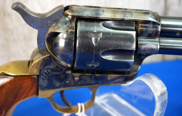 7.5" BBL w/shark fin front sight; case hardened receiver; brass handle straps; smooth wood grips; 6-shot fixed cylinder; has some scratches on the bluing and some marks on the cylinder; looks fired but overall nice; comes w/non-factory hard case; Italy; SN#B1136; A-347
