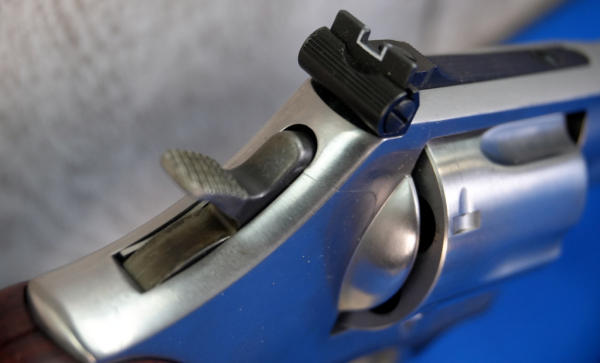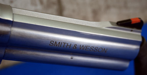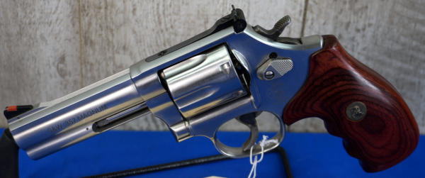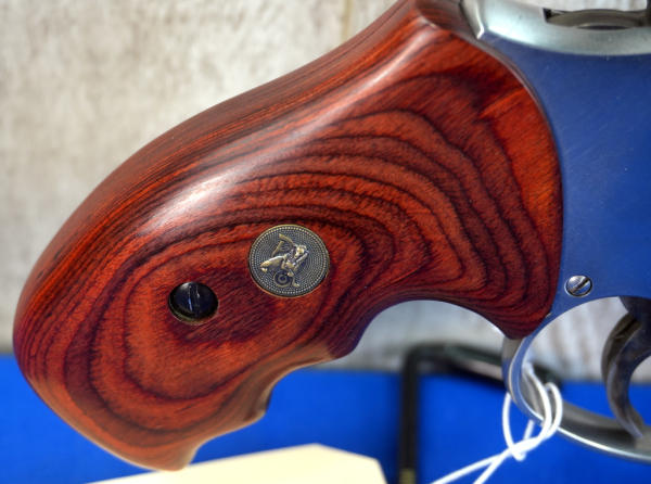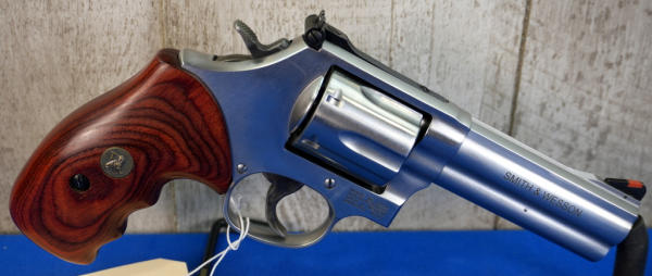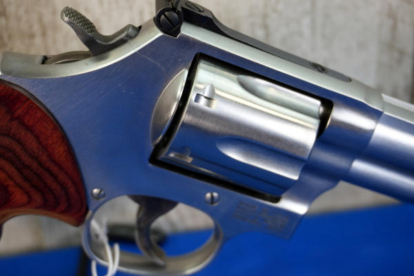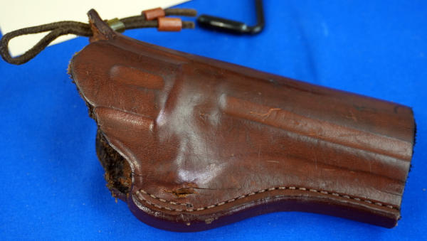4" Stainless barrel w/red ramp front sight & rear white outline; Pachmyer wood finger groove grips; 6-shot swing out cylinder; molded leather holster; looks very clean used condition; USA; SN#DRZ6895; A-343