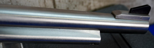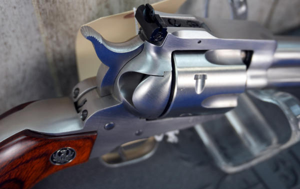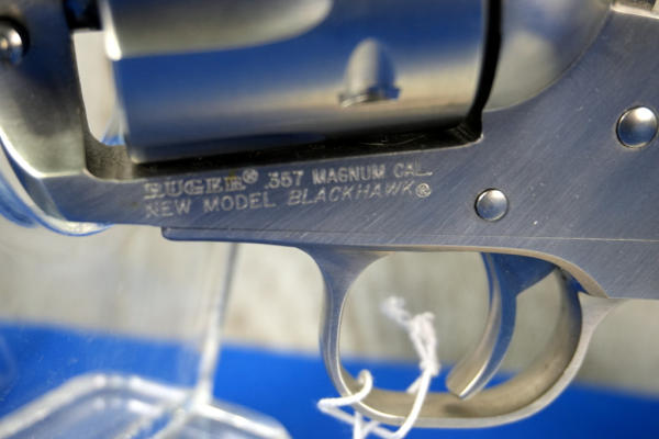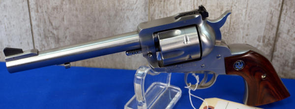6.5" stainless barrel; wood grain laminate smooth grips; 6-shot fixed cylinder; blade front sight w/rear adjustable; includes factory hard case; clean used condition; USA: SN#38-31041; A-347