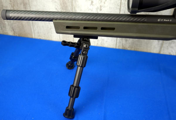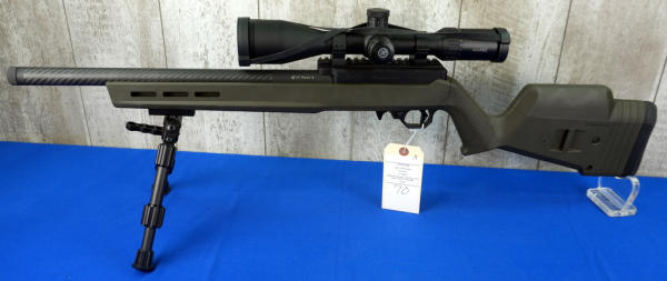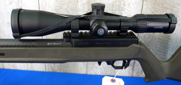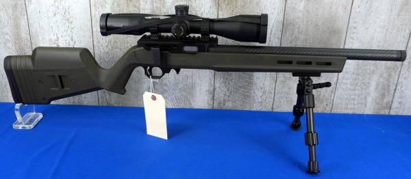 17" Carbon fiber BBL w/threaded muzzle; Dark military green Magpul stock; has unique fast pull bold; Hawke Vantage 30 WA SF IR 4-16x50 scope w/scope box; factory hard carry case; mint; USA: SN#VFS01639; A-318
