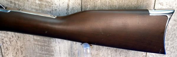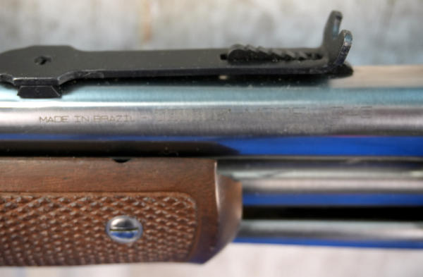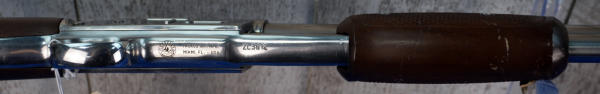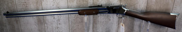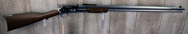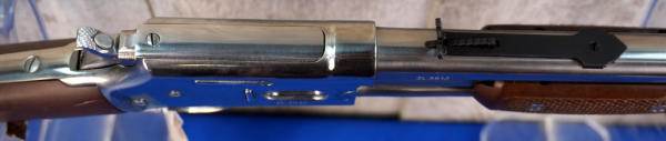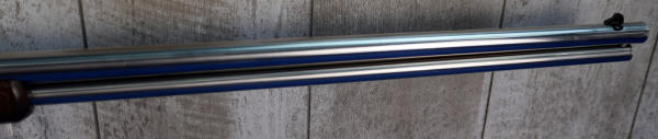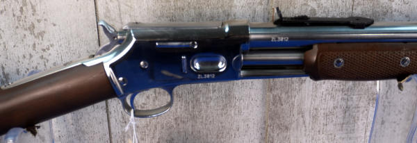 26" Stainless Barrel; wood stock has a few marks from storage and the start of a small hairline crack behind receiver on right side; smooth action; nice polished finish; metal butt plate; these were a clone of the old Colt Small Frame Lightning; does have original box, not pictured, owner found it after guns were cataloged; Brazil; SN#ZL3812; A-347