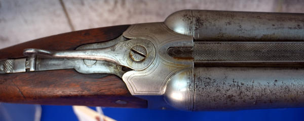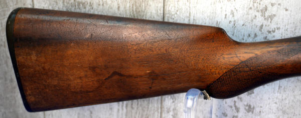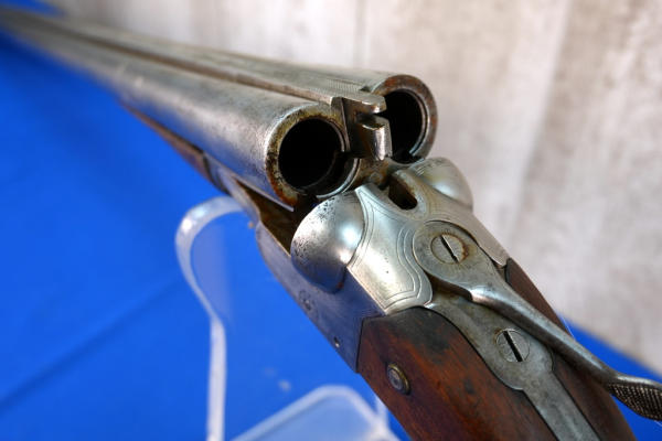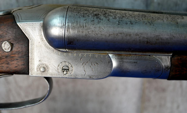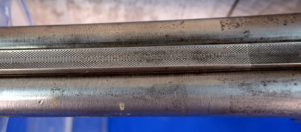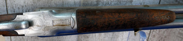 32" BBLs; bluing is gone; factory scroll engraving on receiver; easy break action w/extractors; wood stock has field wear; plastic butt plate; some pitting on right barrel; both FC; two triggers; bores have some spotting inside; USA: SN#51083; A-332
