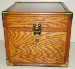 16" tall, 8" across, sample is wood with metal bands with original brass tag and nameplate tag, missing two access doors, otherwise nice, case has a broken leather strap and general wear, great looking sample
