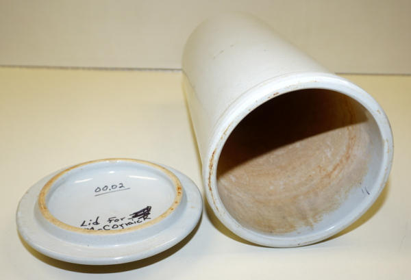 15.5" tall, no chips or cracks, but the used and has the glaze gone on the inside; lid is mint too