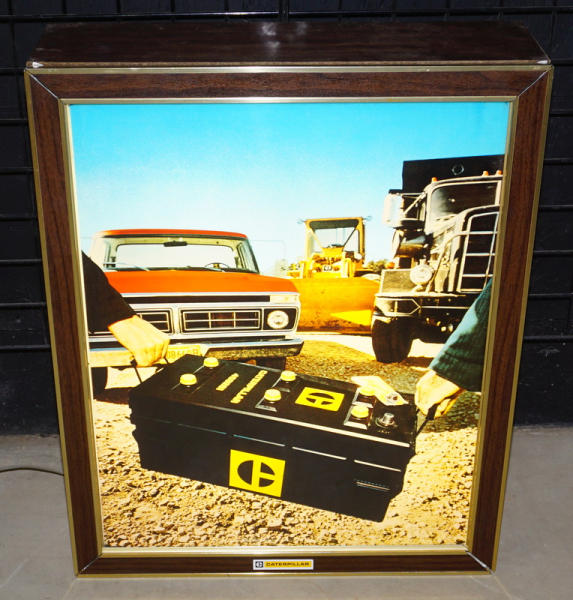 30"x25"x8" thick, CAT decal on the frame, great insert showing the CAT battery with a Mid-70's Ford Pickup and Mack Dump Truck in the background, some scuffs to the face, but overall nice; no shipping, pickup only