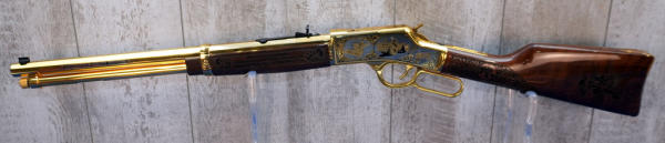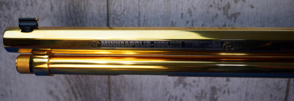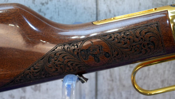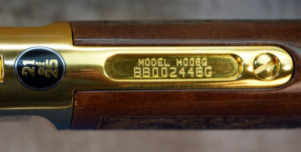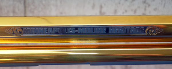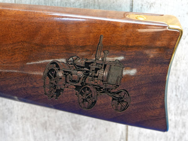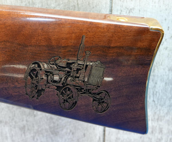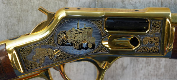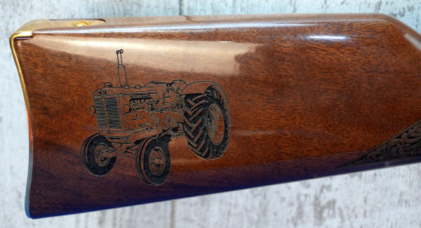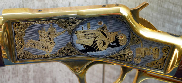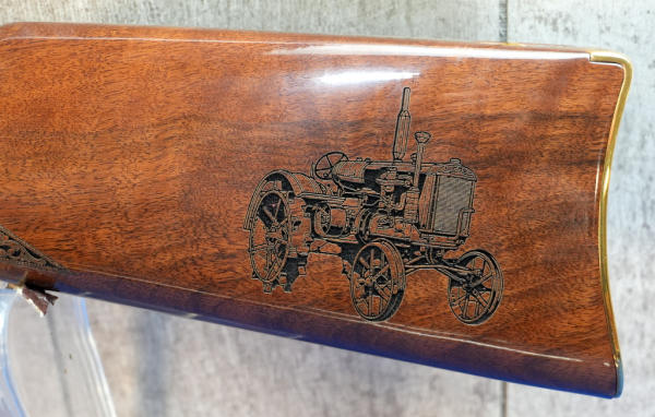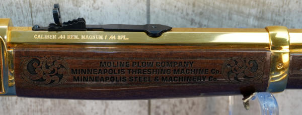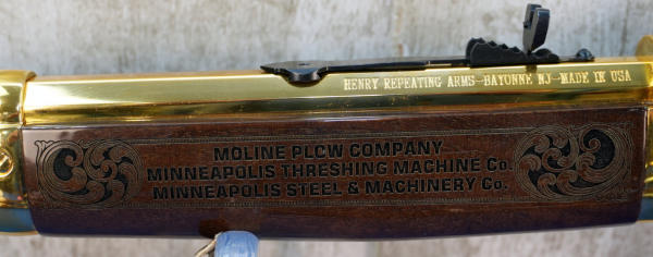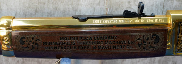 NIB; No. 21 of only 25 mfg.; all gold finish; 19.5" Oct. Barrel; includes vintage to modern tractors; Forearm reads "Moline Plow Company - Minneapolis Threshing Machinery Co. - Minneapolis Steel & Machinery Co."; includes the A4T-1600 4WD, Combine, G-1000 and others; Barrel has "Minneapolis-Moline Heritage" & "Built to do the Work"; factory box; Mdl.H006G; SN#BB002446G