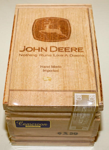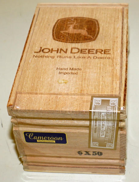 7"x4"x4" wood box with laser engraved lid, this is sealed; we sold an open box for the same seller last month, all the cigars inside have the JD logo on it too, great set