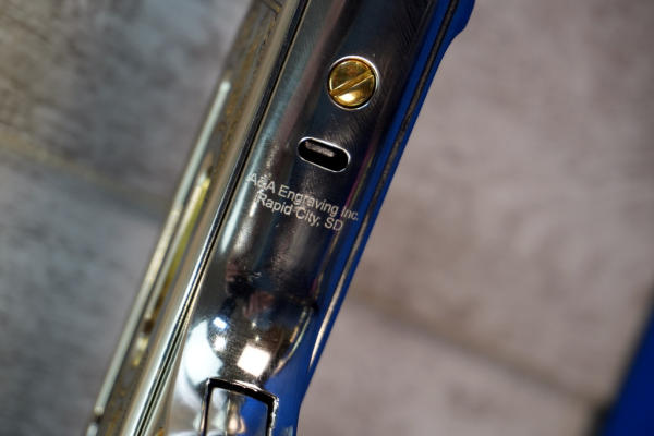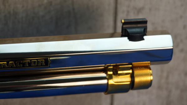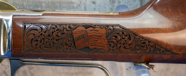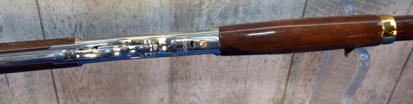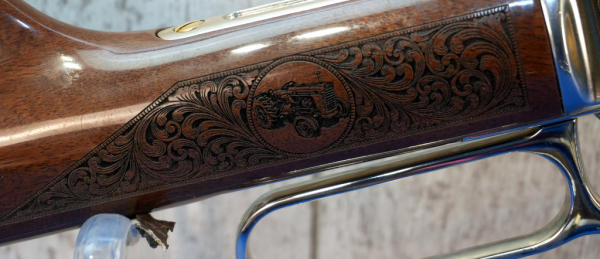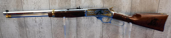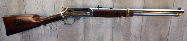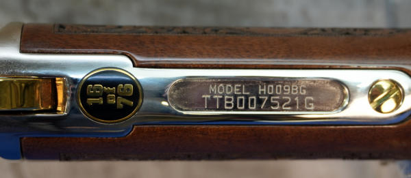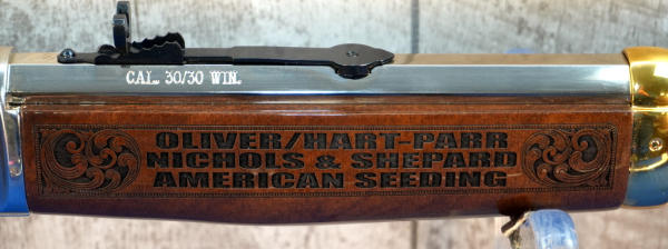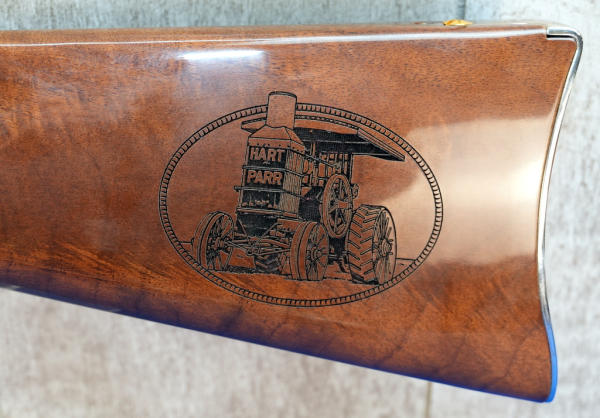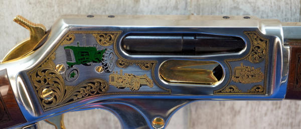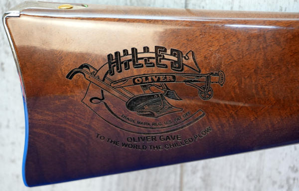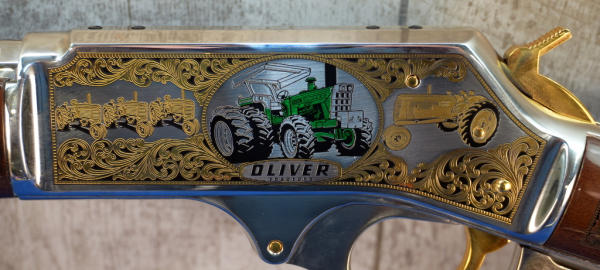 NIB; No. 16 of 76, commemorating the last Oliver Tractor built in 1976; 20" Oct. Barrel in polished stainless finish w/gold inlay on receiver and gold accents with barrel band, receiver cap & trigger; has Oliver Green on two tractors; shows vintage to modern including Hart-Parr; forearm has " Oliver/Hart-Parr, Nichols & Shepard & American Seeding"; "Founders of the Tractor Industry" & "Traction Motor/Tractor" on barrel; includes early Oliver Chilled Plow logo on stock; factory box; Mdl. H009BG; SN#TTB0075521G