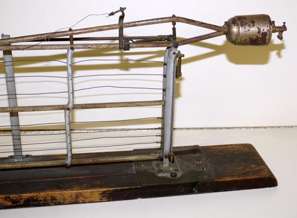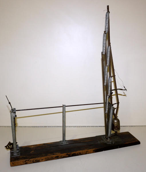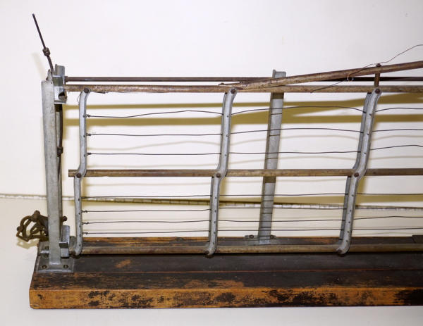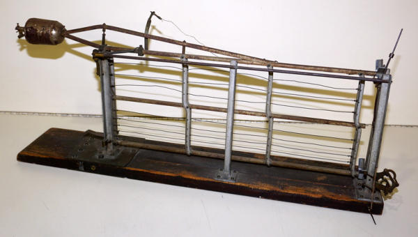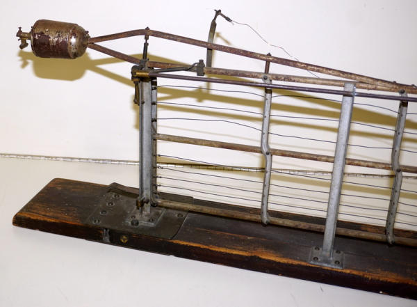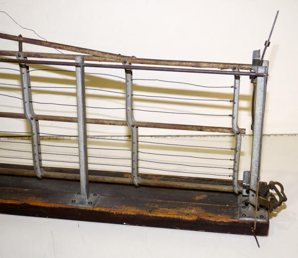 25" long, 11" tall closed, the gate lifts straight up and folds with a large counterweight on the end, nice patina, I do not see a name on it