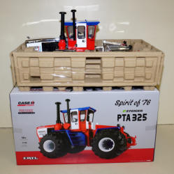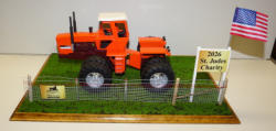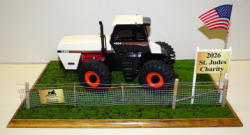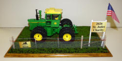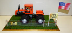 Ertl Casting, but Crab steer added, motor swapped to a Cummins, 3pt, Hyd outlets, grab rails, muffler & more; all mounted to a 25"x16" board, with realistic turn, woven wire w/ 2-strand barbed wire fence, American Flag & 2026 sign