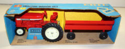 Wow, what a find! Tractor is the cream wheels, long decal and no headlights version; toys are all near mint with only some light play wear on the hitches; all have matching diecast rims except the wagon is solid rubber tire wagon; Box is complete with the liner, a little crushed and has a bit of a puncture at the base of the silo, but overall very good condition and I'd rate at an 8 condition; we have never offered one of these sets through our auctions and this one we are selling for the original owner that received it for a Christmas present from an uncle that was an AC dealer, but he was a "city" kid and didn't really play with farm toys! Not perfect, but rarity out weighs any condition issues!