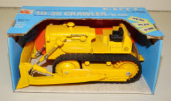 Rare original set, condition is good, blue one has a cracked rear rim, but it's stable, Yellow one has been broken around the rear end and glued a long time ago, yellow one is not the best, includes both Demonstration Manuals and other original box with the box liner; we have sold a few of the tractors over the years, but this is the first complete boxed set; Toys are rubber-band powered to show how to keep from rolling over; neat set