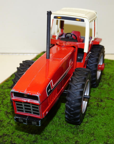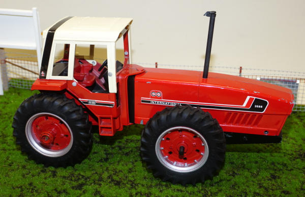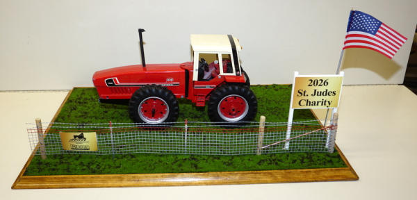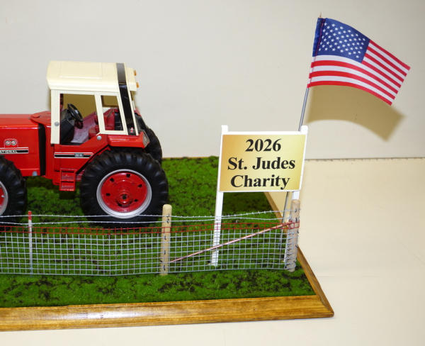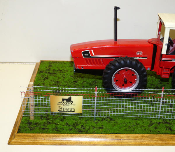 old casting, that has some chips and play wear, custom wheels, custom stack, straight drawbar; all mounted to a 25"x16" board, with realistic turn, woven wire w/ 2-strand barbed wire fence, American Flag & 2026 sign