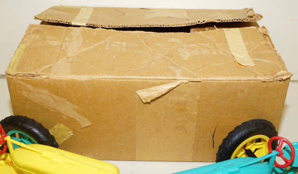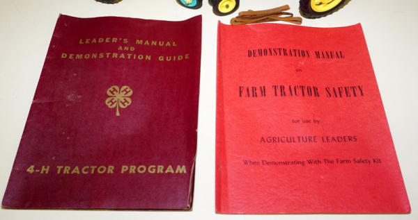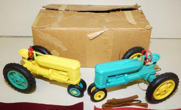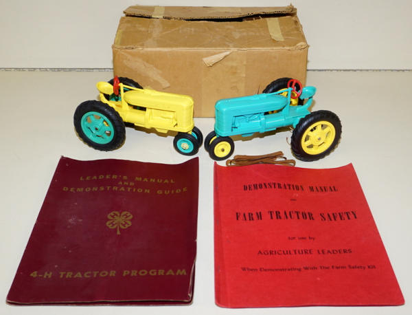 Rare original set, condition is good, blue one has a cracked rear rim, but it's stable, Yellow one has been broken around the rear end and glued a long time ago, yellow one is not the best, includes both Demonstration Manuals and other original box with the box liner; we have sold a few of the tractors over the years, but this is the first complete boxed set; Toys are rubber-band powered to show how to keep from rolling over; neat set