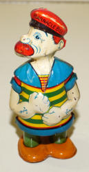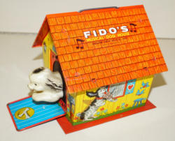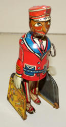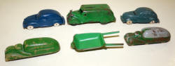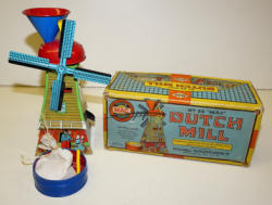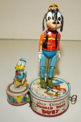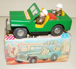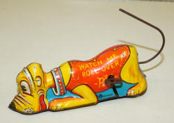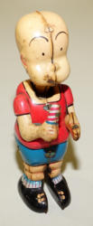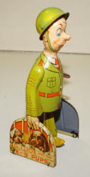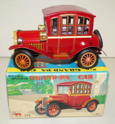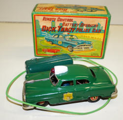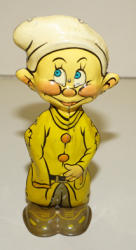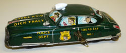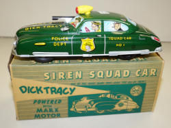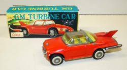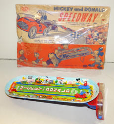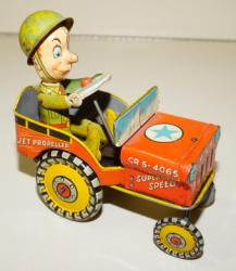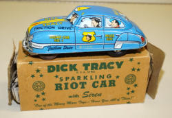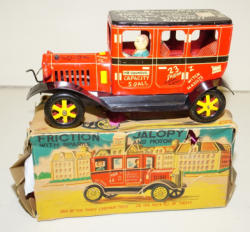 8" long, lightweight tin, windup works, toy is about 85% condition with some old touch-ups on the hood, box is square, but missing end flaps on both ends, box rates 6.5 condition