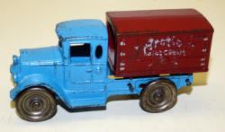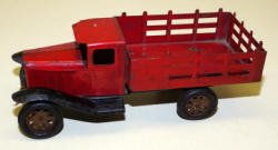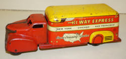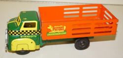 12" long, beautiful and near mint condition truck with only some light box wear; box is poor condition missing all the end flaps; has the tag on it still from the Don Kaufmann collection (Owner of K-B Toys)