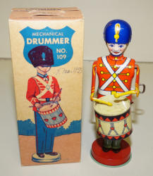 10" long, really nice tin-litho case, original song booklet included, both drum sticks included, but one has a broken handle replaced by a kid with a pencil! Box is good with some general wear