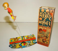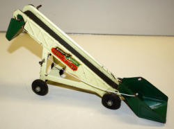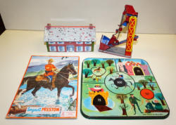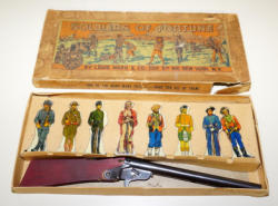9" long, absolutely mint condition toy, parts are still wrapped in cardboard and still taped to the box liner; has the original $10 price tag on it from Peer's of Winner, SD; we sold this piece many years ago when a stash of NOS toys was found out in Winner, box has minor edge wear, but overall is near mint too