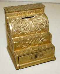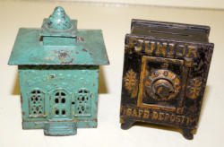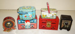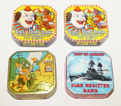 #317 - Lot of Vintage Tin Banks plus an early biscuit basket