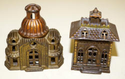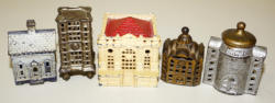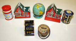 #311 - Lot of Vintage Tin-Litho Banks--includes 2 School Houses, Globe, & others