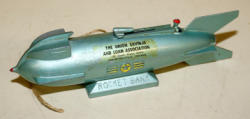 18" long, beautiful & colorful tin-litho design, a few scuffs, but overall is a 9 condition paint toy; only has the back fins for the missile, not a complete missile; Box is complete, has stains on the one side and some water stains, box rates 7 condition, no box liner